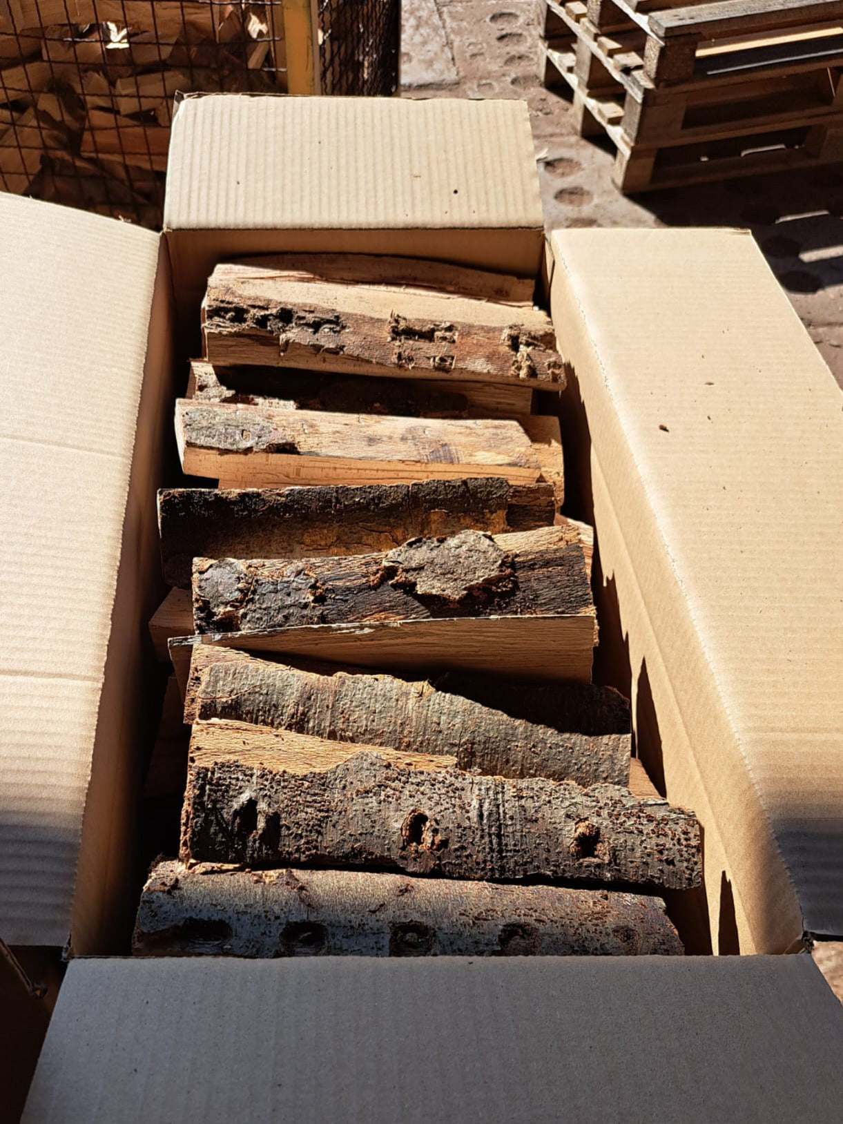 Kaminholz Buche in Kartons, zur sofortigen Verbrennung, Fein gespalten